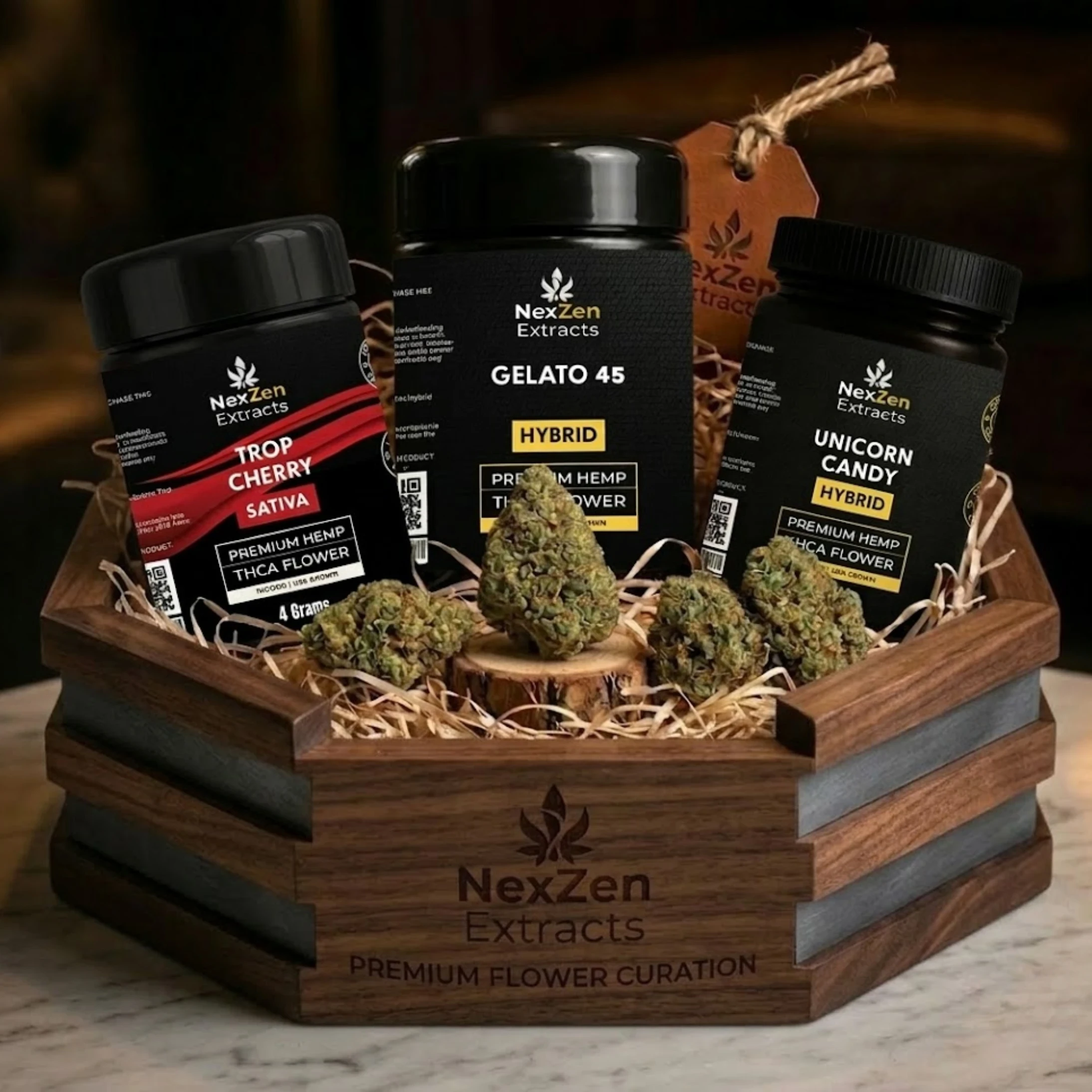 This bundle features three flavorful THCa flower strains — Unicorn Candy, Gelato 45, and Trop Cherry. Each strain is known for its unique terpene profile and balanced hybrid effects, making them great choices for social settings where you want to feel relaxed yet engaged.