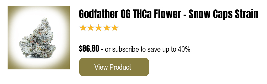 Snowcap Godfather OG THCA flower blends the frosty trichomes of Snowcap genetics with the deep relaxation of Godfather OG.